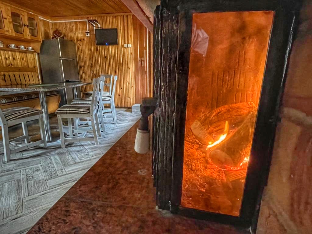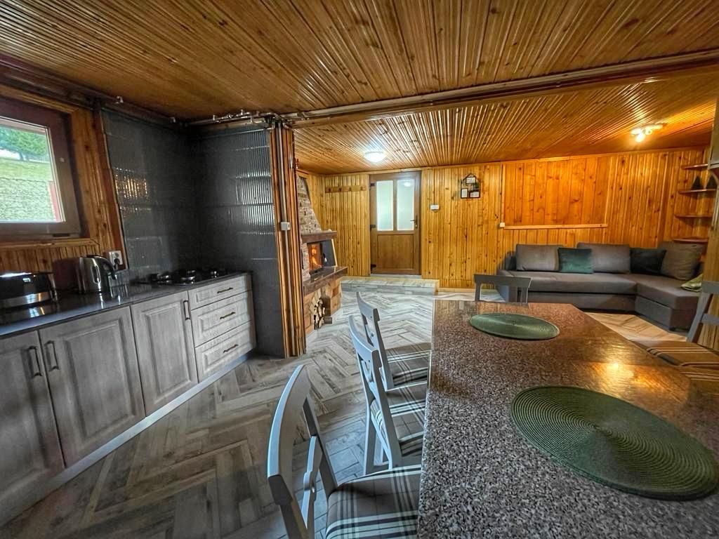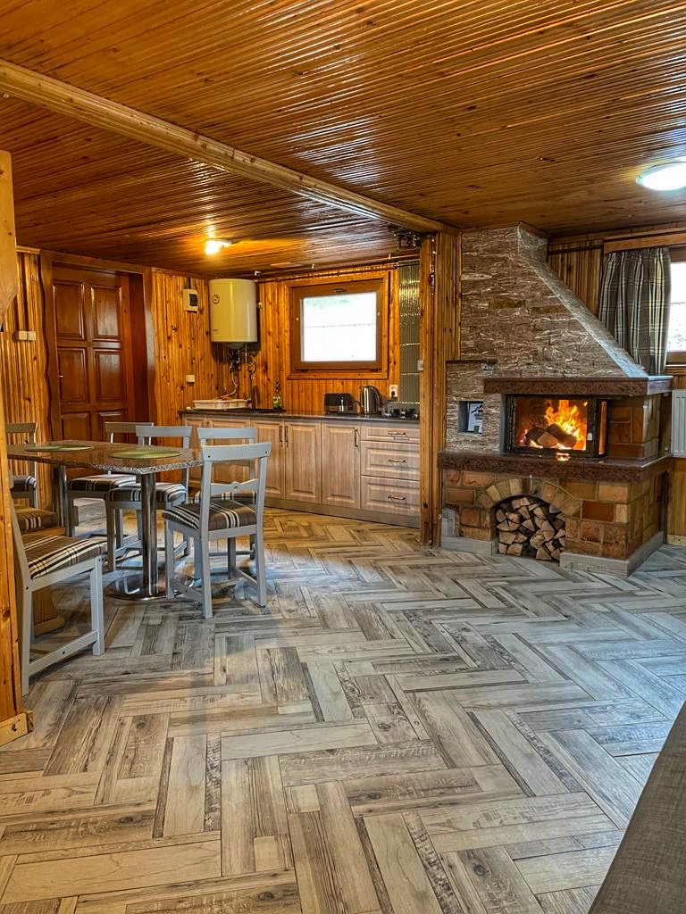Acest living rustic te întâmpină cu pereți din lemn și un șemineu din piatră care aduce căldura serilor la țară. Spațiul este primitor și funcțional, cu bucătăria integrată armonios în decorul country, dotată cu: prăjitor de pâine, fierbător, aparat de cafea, aragaz, frigider spațios, veselă, tacâmuri.